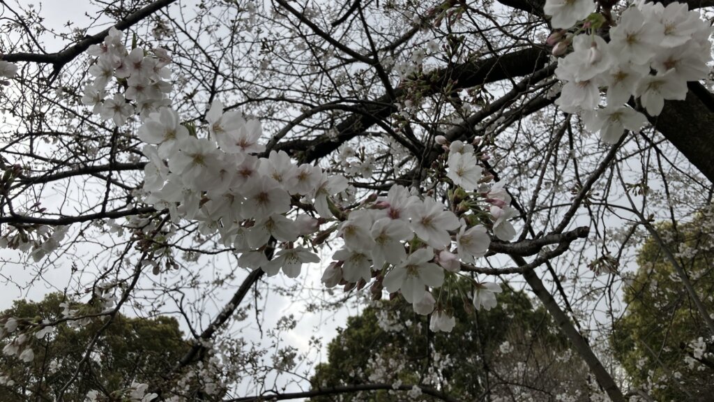 桜は空を背景にすることが多く、カメラは「空の明るさ」に合わせて露出を調整します。